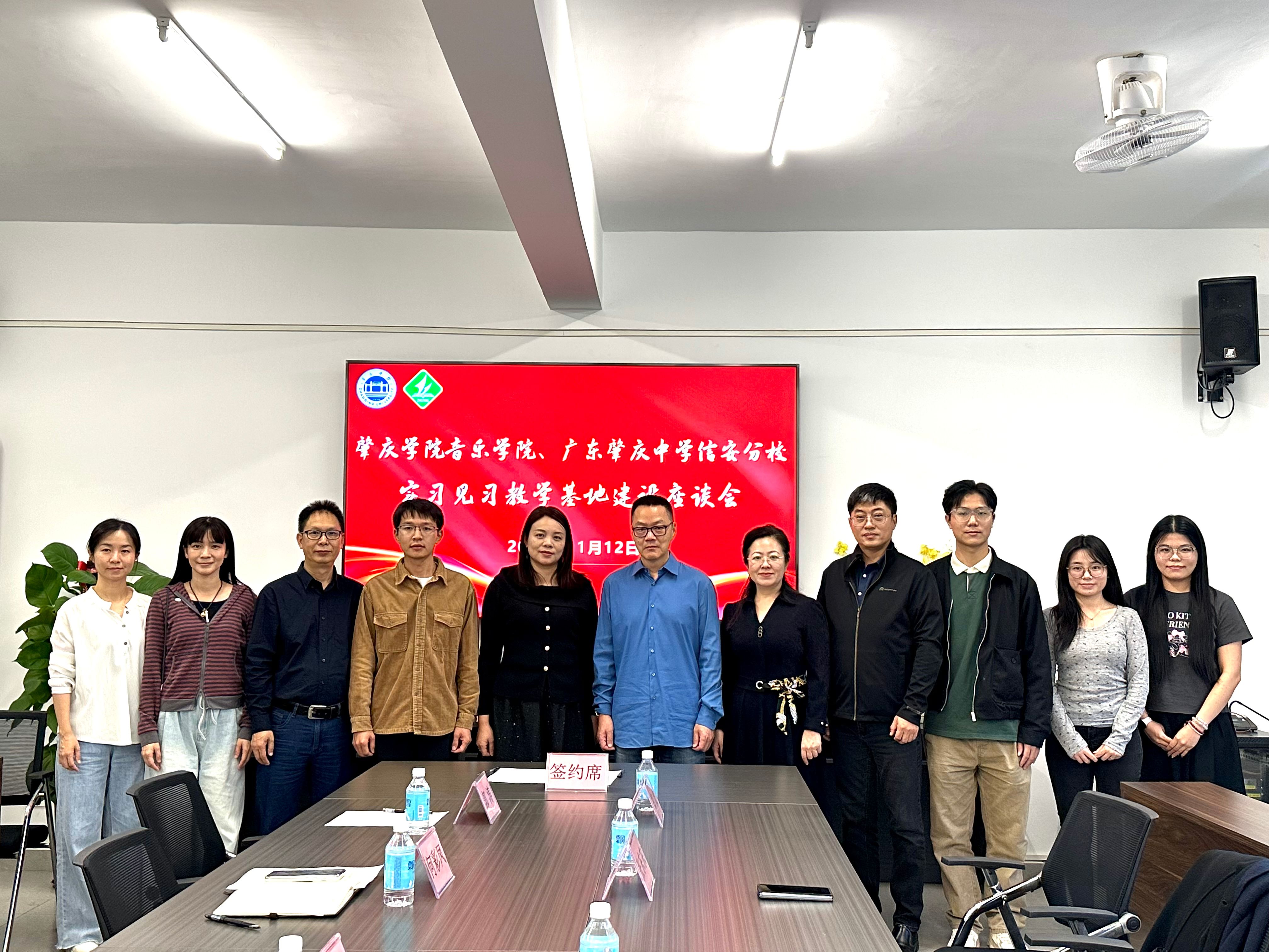 广东肇庆中学信安分校音乐教师李彬、李艳琴、胡琨的陪伴下,参观学校的音乐专业教学设施,随后副校长何彩凤、郭涛老师一同参与座谈会,双方非常期待未来深度合作能取得更加丰硕的成果。会议的最后,“肇庆学院音乐学院与广东肇庆中学信安分校共建实习见习基地”的相关协议签署完成。