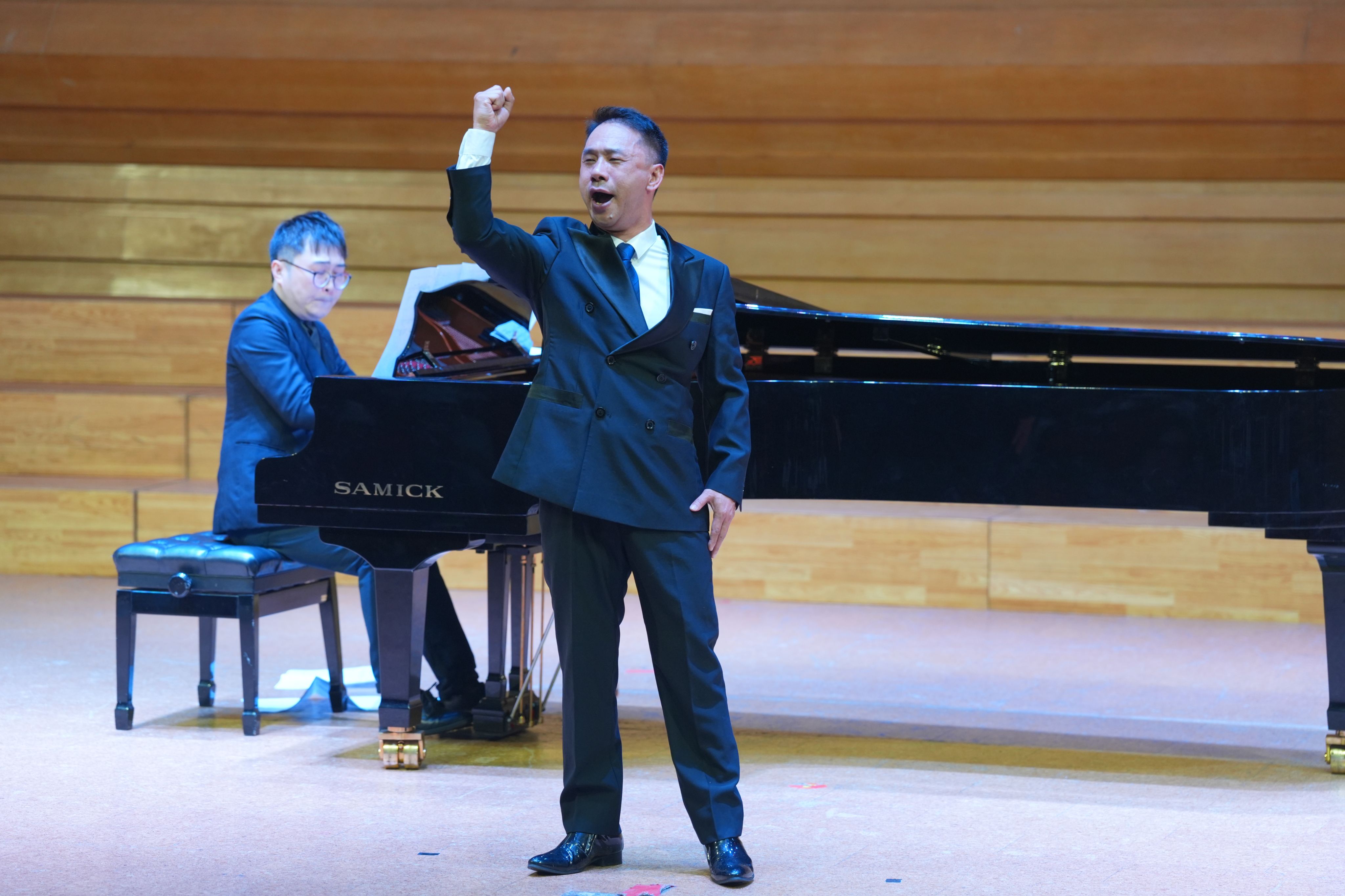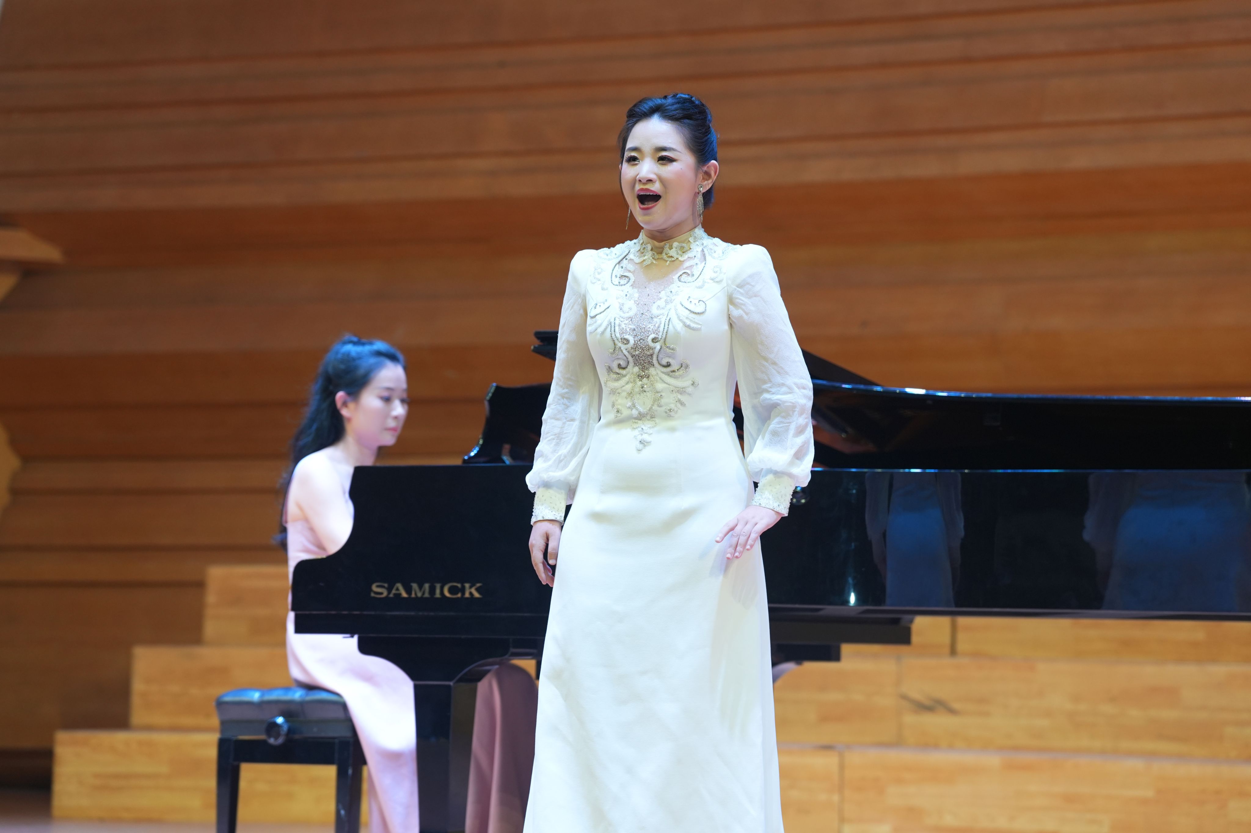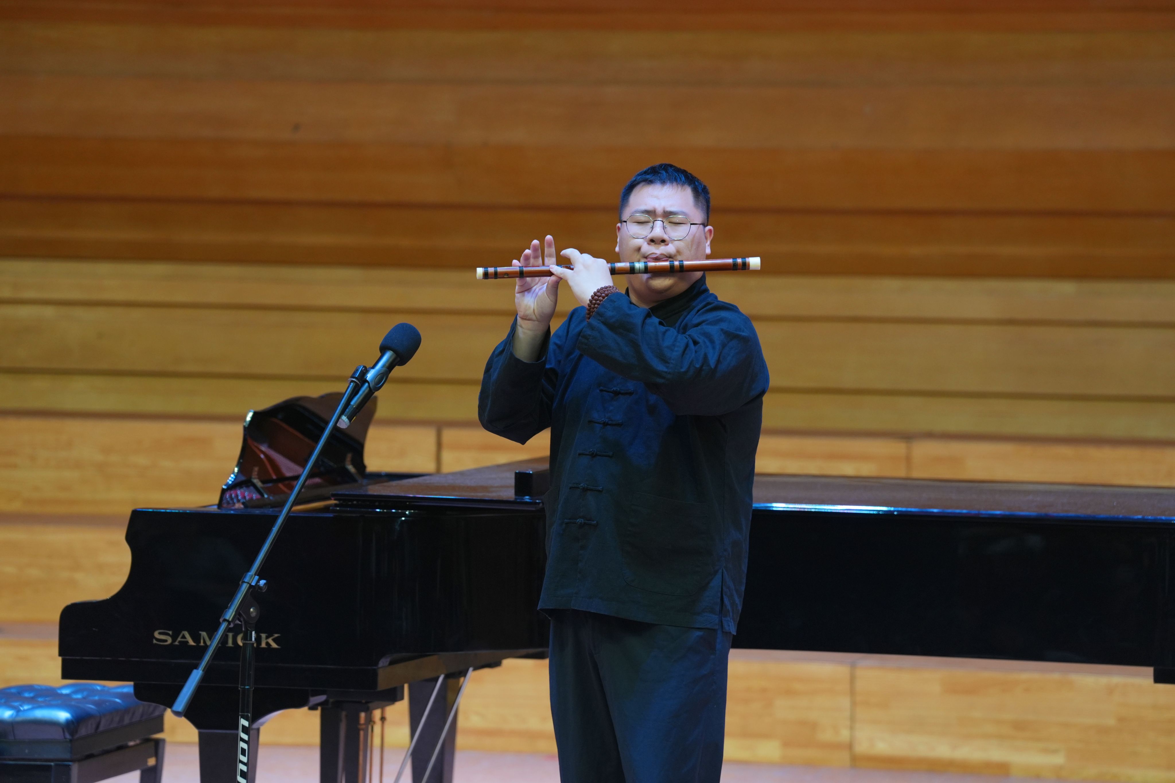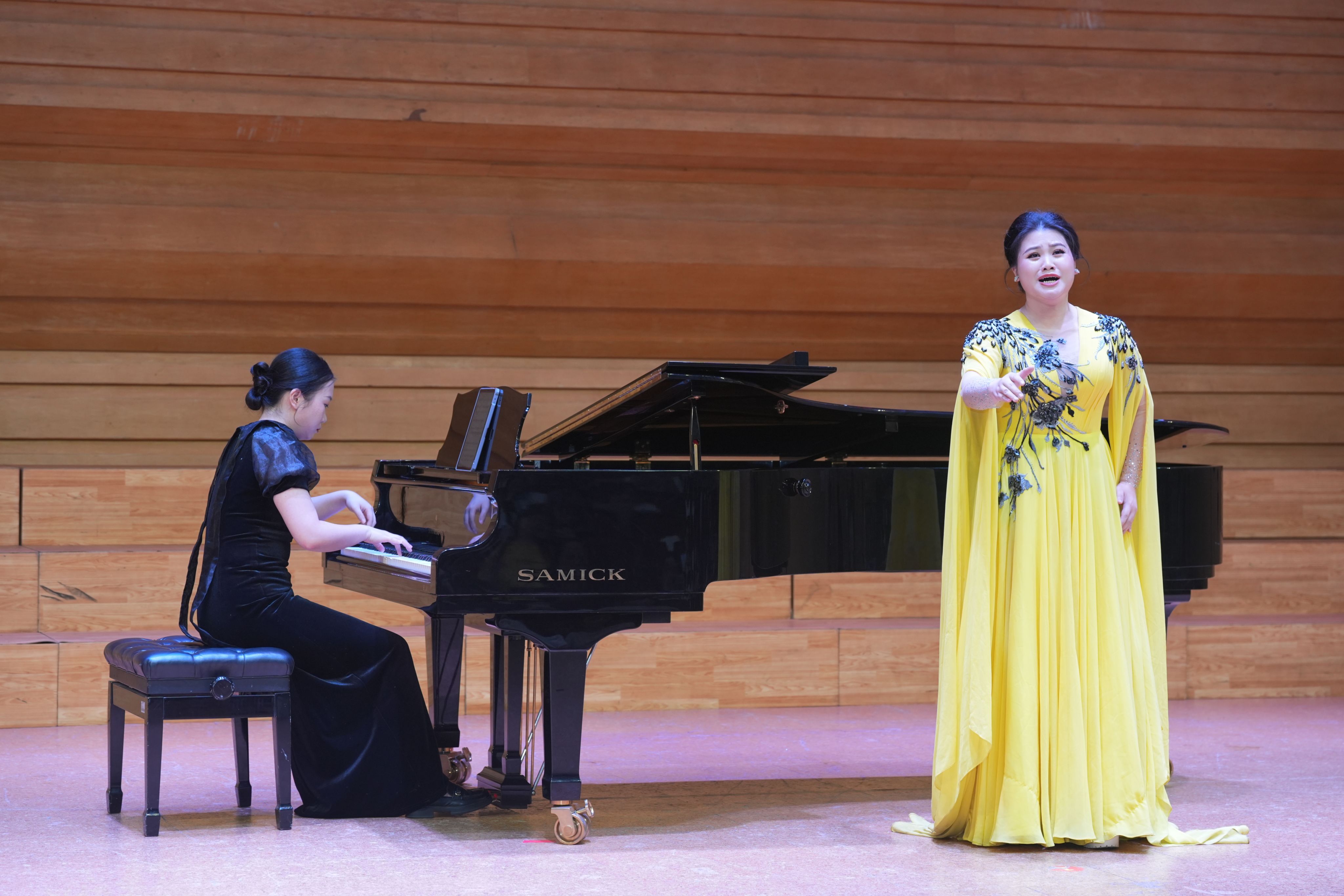 韶关学院音乐与舞蹈学院的师生率先展现专业实力:青年教师欧艳芳以女高音独唱《琵琶行》《我多么想》,传递民族声乐的深厚底蕴;卢映雪老师的古筝独奏《秦土情》与李青欧老师的钢琴伴奏相得益彰,让传统乐器与现代音乐元素完美融合;主持人、该校教师任浩扬跨界登台,以醇厚男中音演绎《吊吴淞》与威尔第经典作品,余韵绕梁;青年教师张思勉献唱亨德尔歌剧《阿塔兰塔》咏叹调《亲爱的森林》与中国当代艺术歌曲《定风波·莫听穿林打叶声》,让西方古典歌剧的典雅与东方古典诗词的意蕴自如穿梭、婉转萦绕;青年钢琴教师庄祐甯演绎柴可夫斯基《1812序曲》,指尖在黑白琴键间流转碰触,激昂悦动的音符随琴音流淌,铿锵力道直抵人心,令观众深度沉浸;夏文轩老师的竹笛独奏《山村迎亲人》更具画面感——其悠扬婉转的笛声甫一响起,村里百姓喜迎亲人的热闹图景便跃然眼前,笛声似穿越溪涧山谷,将家乡的融融暖意悄然送抵观众心间;男高音歌唱家蒋志伟老师则带来两首经典歌剧选段,周正老师担任钢琴伴奏:以深情演绎民族歌剧《八一起义》选段《往事重现》,传递厚重历史情感;再唱意大利作曲家玛斯卡尼《乡村骑士》选段《妈妈,这酒好浓烈》,尽显西洋歌剧魅力,钢琴伴奏与歌声默契相融,成为声乐表演的亮眼环节。