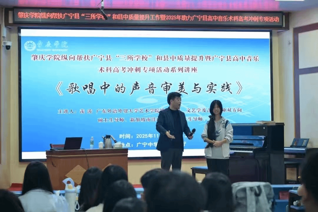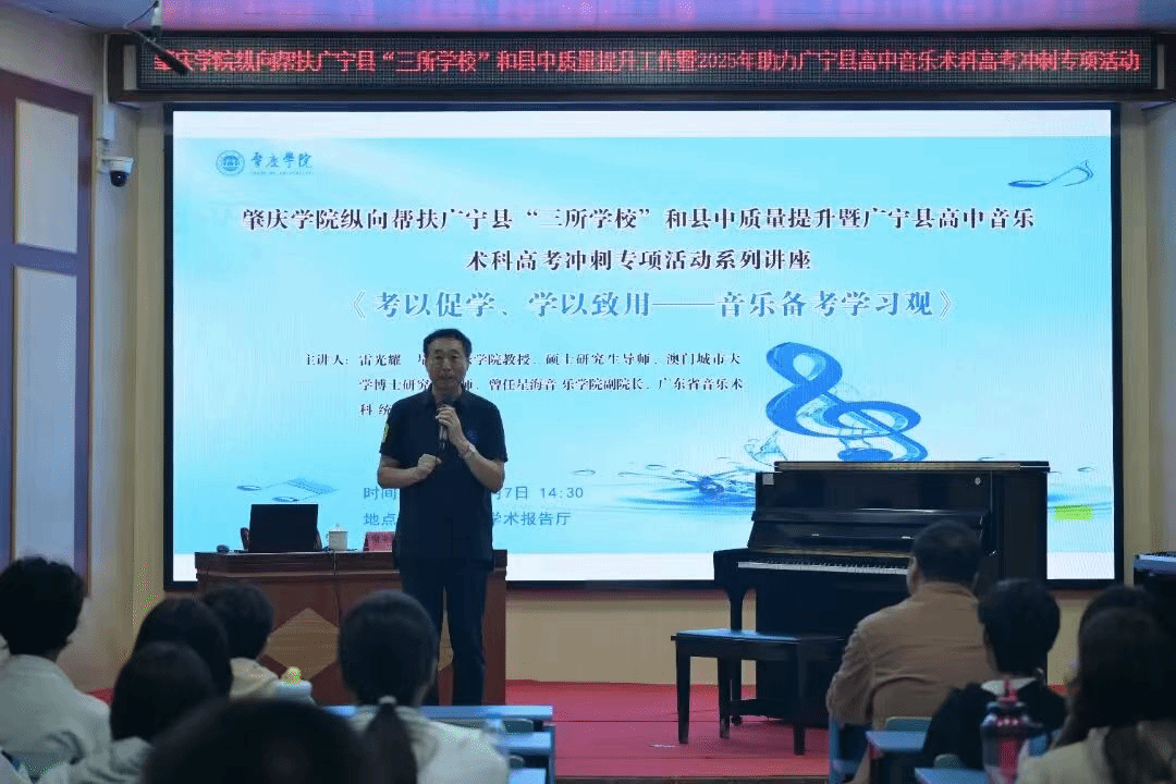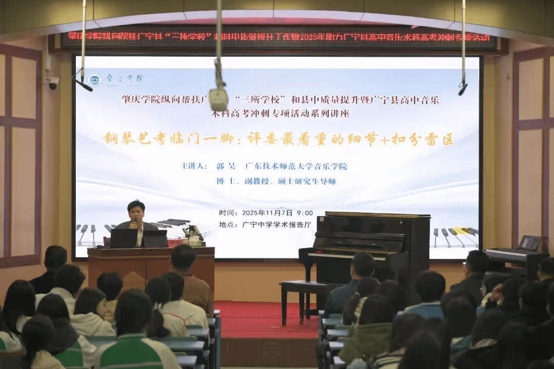 2025年11月7日,肇庆学院纵向帮扶广宁县“三所学校”和县中质量提升暨2025助力广宁县高中音乐术科高考冲刺专项活动系列讲座在广宁中学举行,100多位师生参与其中。