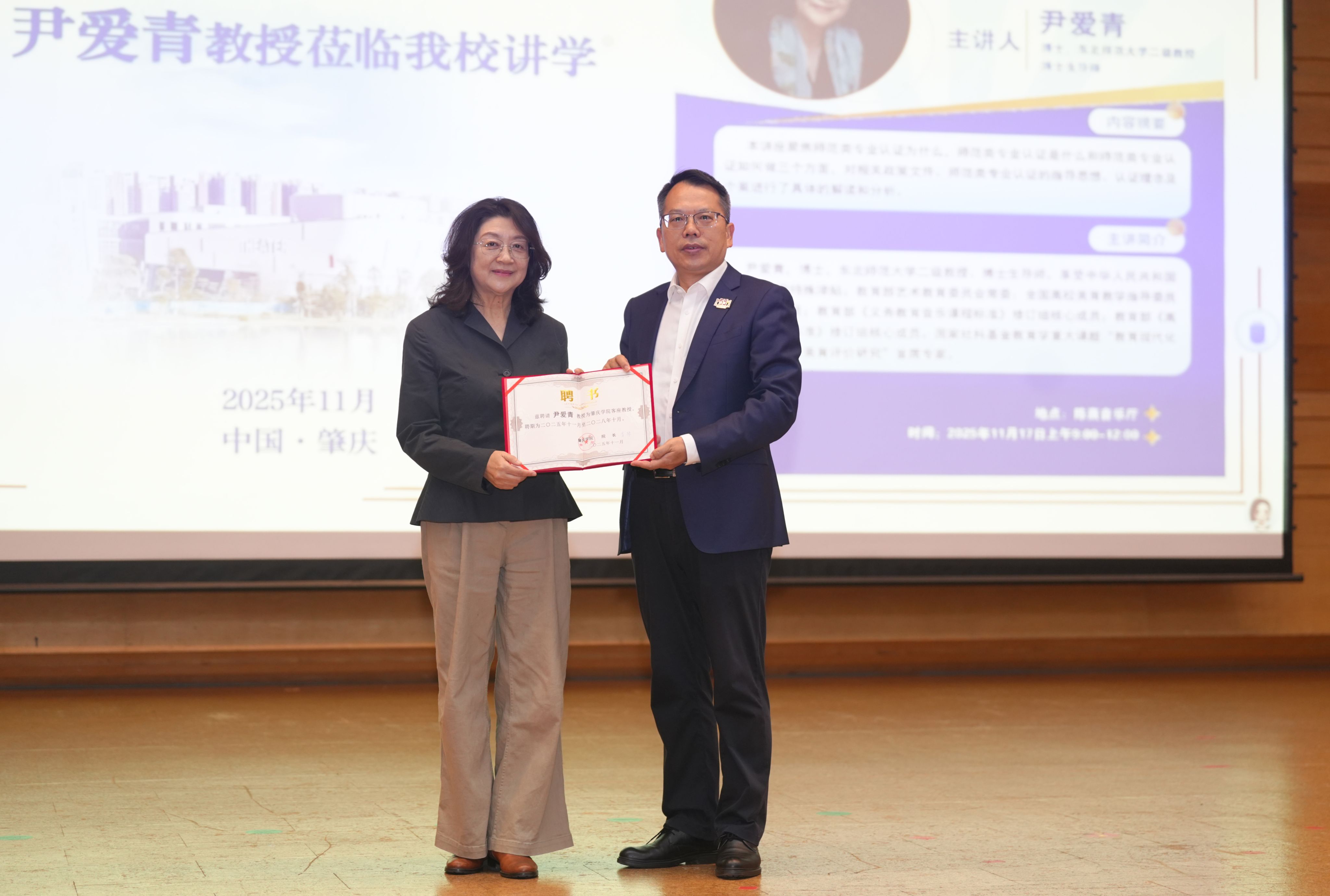 开讲前,胡文涛副校长代表学校,在音乐学院贵宾室会见尹爱青教授,并正式聘请其为肇庆学院客座教授。胡文涛副校长指出,尹教授的加入是学校音乐教育专业发展的重要契机。“尹教授深厚的学术造诣、开阔的行业视野与丰富的实践经验,将为我校师范类专业建设、音乐教师教育质量提升注入强劲动力,期待未来在课程体系优化、骨干教师培养、重点科研项目合作等方面碰撞出更多创新火花。”尹爱青教授则对学校的信任表达了诚挚感谢,她坦言:“成为贵校客座教授,是荣誉更是责任,我将尽己所能,助力学校在音乐师范教育领域的探索与突破。”