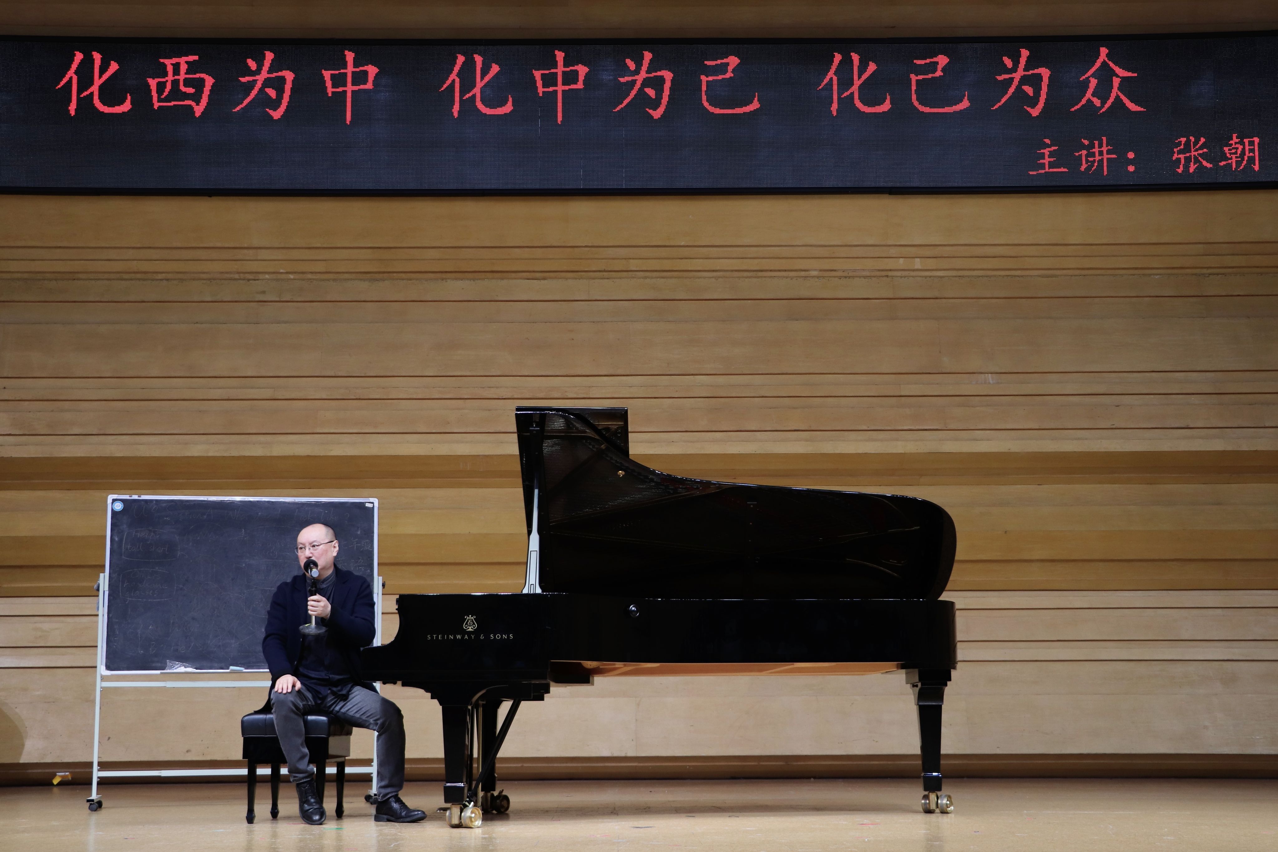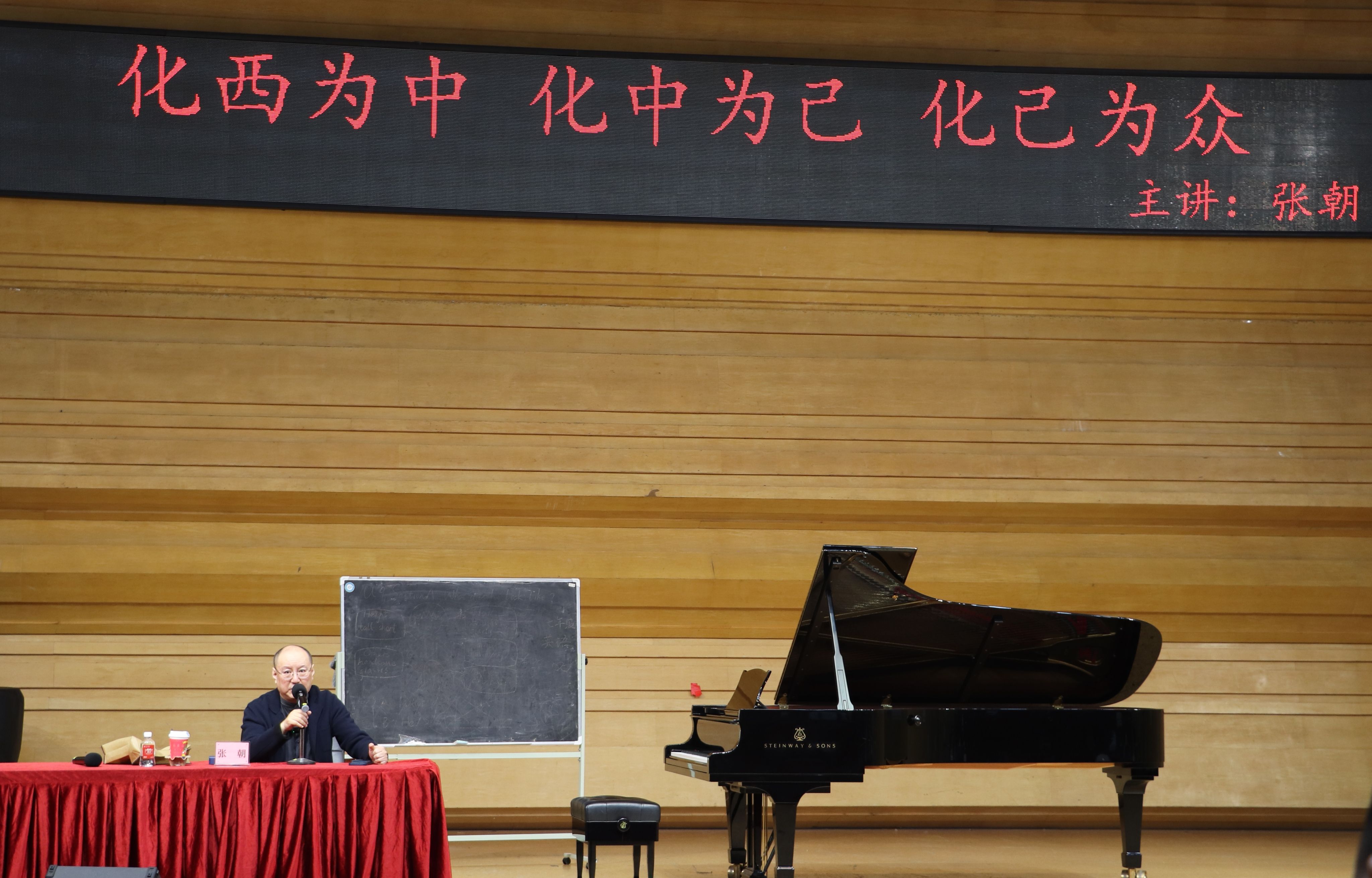 在 “化中为己” 板块,张朝教授结合自己对中国传统文化的长期浸润与感悟,解读意境转化的艺术密码。自幼受诗词、绘画、古琴文化熏陶的他,深知中国艺术 “以少胜多、借景抒情” 的特质。他分享道与音乐的关系。在创作中常以孟浩然《春晓》的哲思、张若虚《春江花月夜》等古诗词的意境为灵感源泉,力求让音乐承载同等深度的精神内涵;而古琴 “一音一世界” 的理念,更影响了他的钢琴作品创作与演奏指导 —— 每个音都蕴含实、虚、噪、柔等丰富表现力,需通过精准的音色控制与节奏弹性,传递山水云雾、天地空间的意境。他还提及自己将中国绘画 “六远法” 融入音乐创作的尝试,通过踏板运用模拟宣纸晕染效果,让音乐呈现出多层次的空间感,这一创新源于他多年对传统书画艺术的潜心钻研。