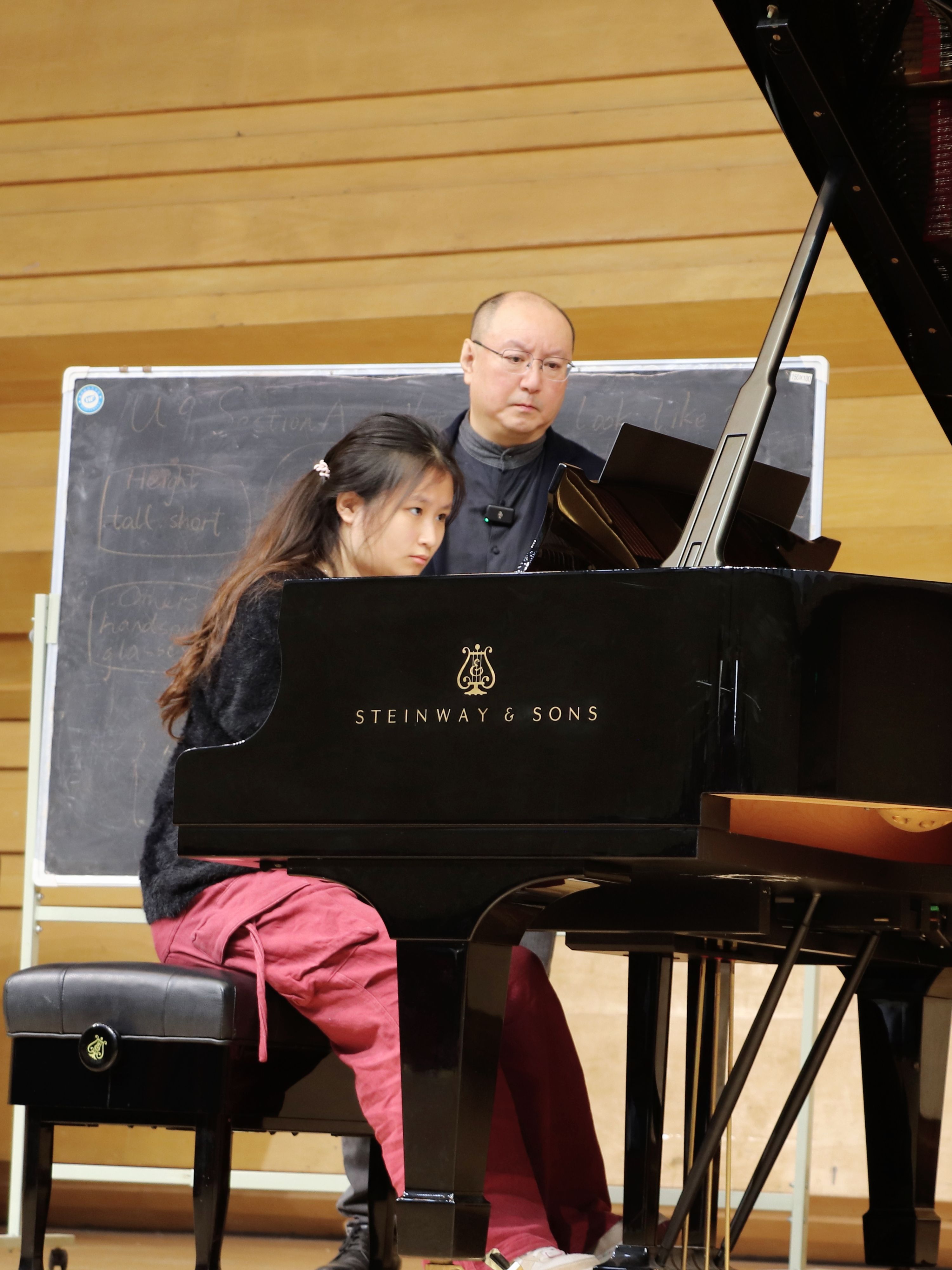 讲座现场的学生演奏与互动环节精彩纷呈。两位同学现场演绎相关作品后,张朝教授结合自身创作及表演经验,从结构过渡的自然性、节奏把控的精准度、歌唱性的贯穿等方面进行细致指导。他以《在那遥远的地方》改编曲为例,提醒同学们 “技术永远为音乐服务,避免弹成练习曲,要通过音色变化与层次营造,展现作品的朦胧意境与交响性”。