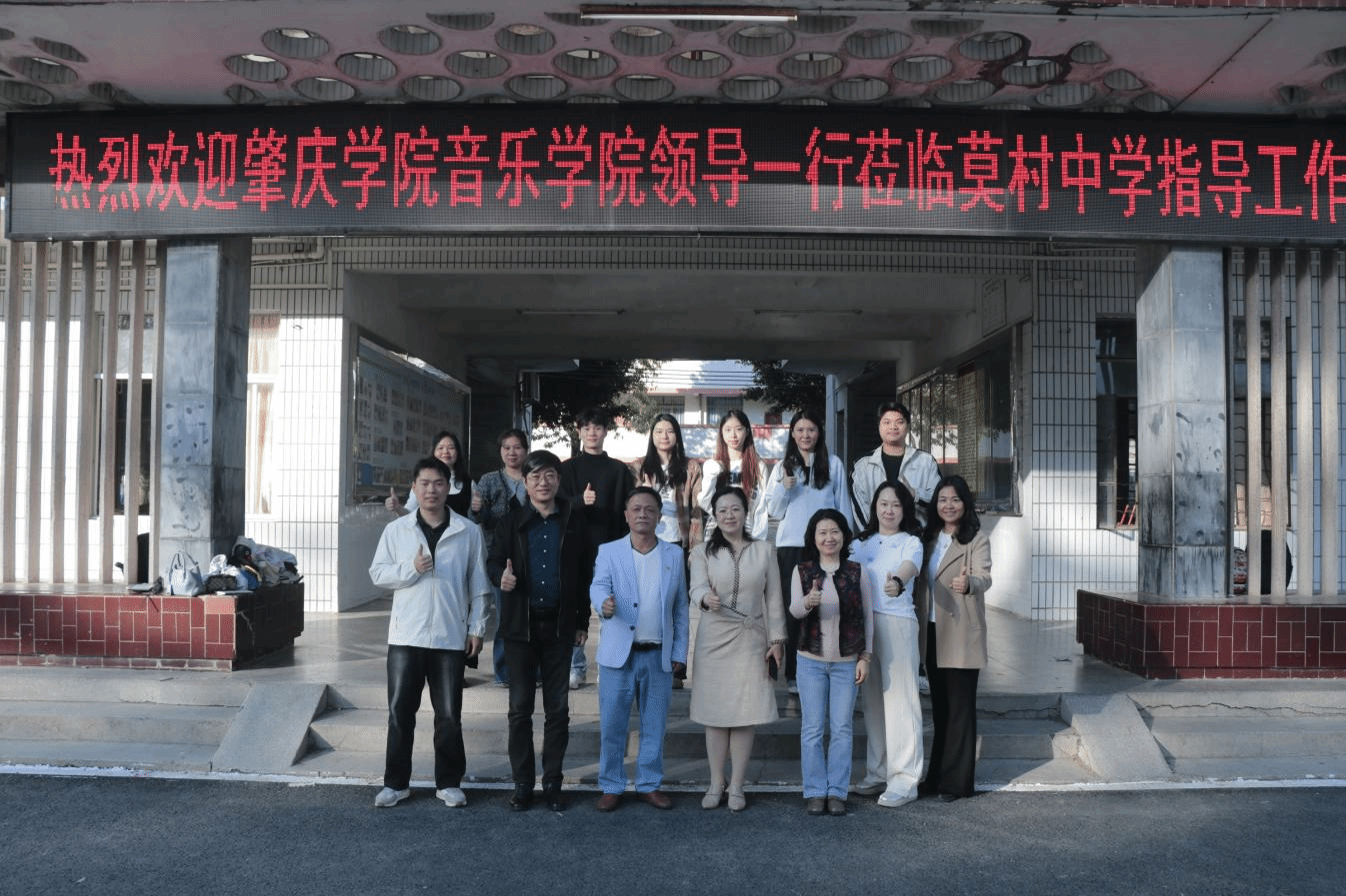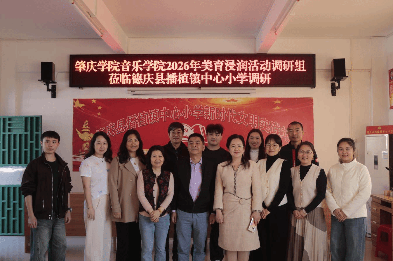 为深入贯彻国家新时代学校美育工作相关政策要求,切实推进美育浸润行动计划落地见效,2026 年 3 月 12 日,肇庆学院音乐学院副院长王伽娜带队,器乐教研室主任郑虎、副主任牛飒飒、理论教研室周颖、音乐研究所王丹一行赴德庆县播植镇中心小学、莫村中学开展美育浸润专项调研与合作对接工作,通过实地考察、座谈交流的方式,精准了解乡村学校美育发展现状与需求,敲定校地合作具体方案,携手为乡村美育发展注入专业动能。