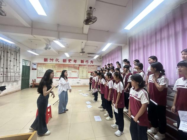 14日上午,工作组走进广宁中学新校区,实地参观琴房与教学设施,并举行教学乐器捐赠仪式。随后,面向高一、高二学生分别举办声乐、钢琴、器乐艺考备考专题讲座。下午,一行前往广宁中学城南学校,看望慰问在岗实习生,细致了解其生活与工作近况。15日上午,工作组深入古水镇中心小学,聚焦“三所学校”办学条件与育人实效进行实地考察并座谈交流。王涛副院长勉励驻点实习生珍惜基层锻炼机会,淬炼师范技能。期间,工作组还现场指导了该校“苔花开”节目排练。当日下午,工作组转赴古水中学,参观校园文化并对该校合唱团演唱的广宁方言童谣进行了细致的指导。