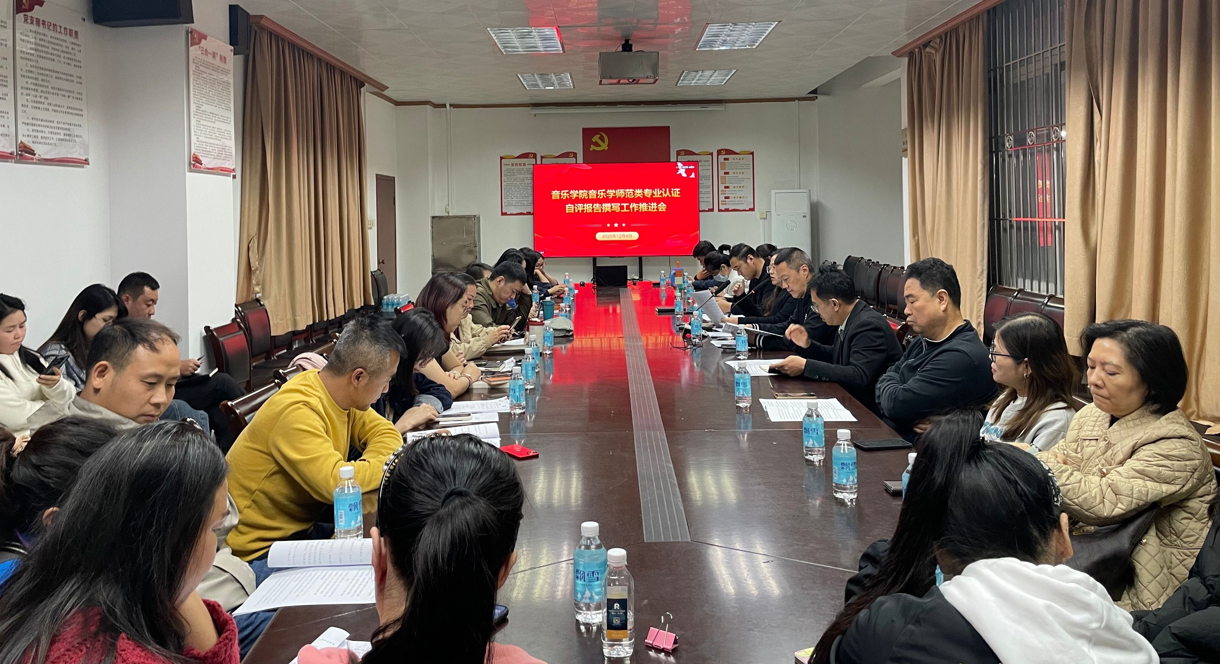 2025年12月4日,音乐学院召开音乐学师范类专业认证自评报告撰写工作推进会会,学院领导班子成员、师范认证工作小组成员及骨干教师代表参加会议。会议围绕认证工作实施方案、任务分工及进度安排展开深入研讨,明确要以“全员参与、协同推进”为原则,扎实做好各项准备工作,稳步推进专业建设各项工作。