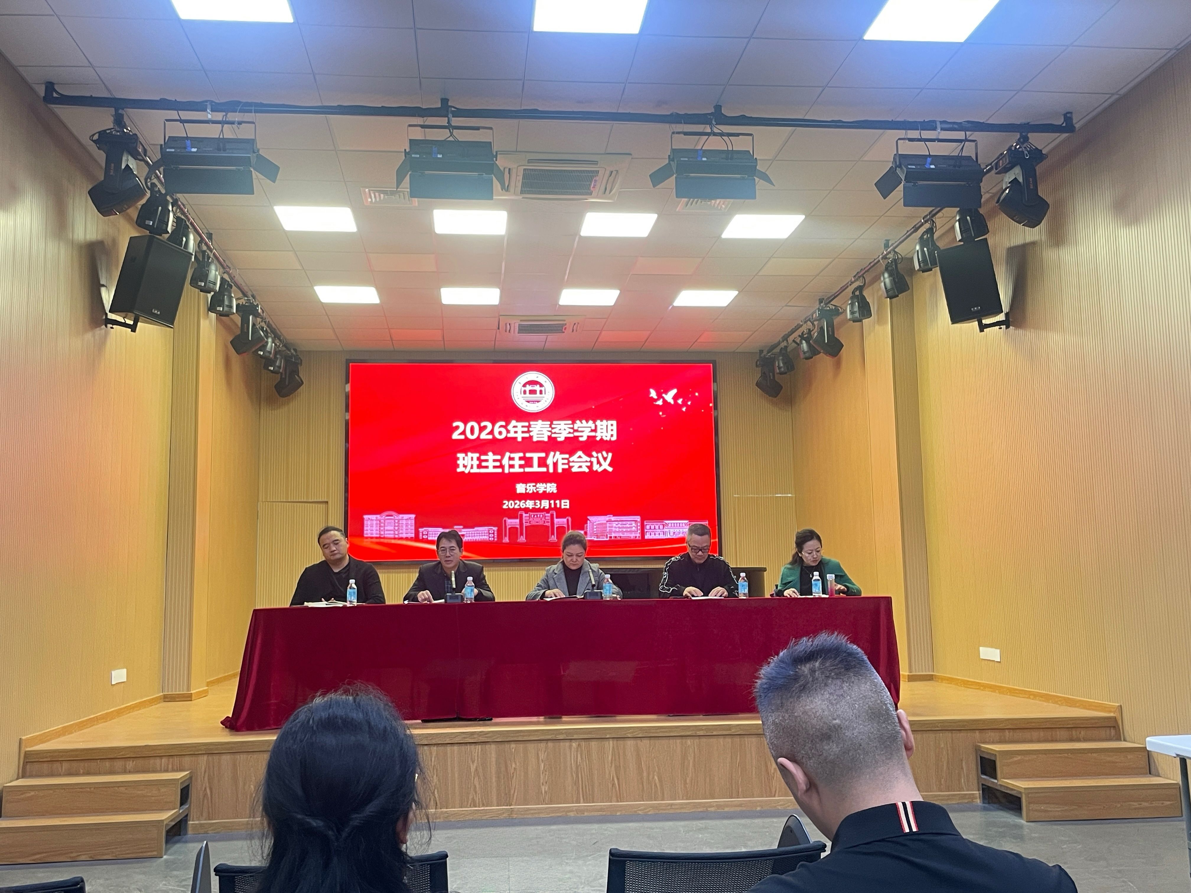 本网讯 3月11日下午,音乐学院2026年春季学期班主任工作会议在观摩厅召开。学院领导班子、全体辅导员和班主任参会,会议由党委副书记何其国主持。